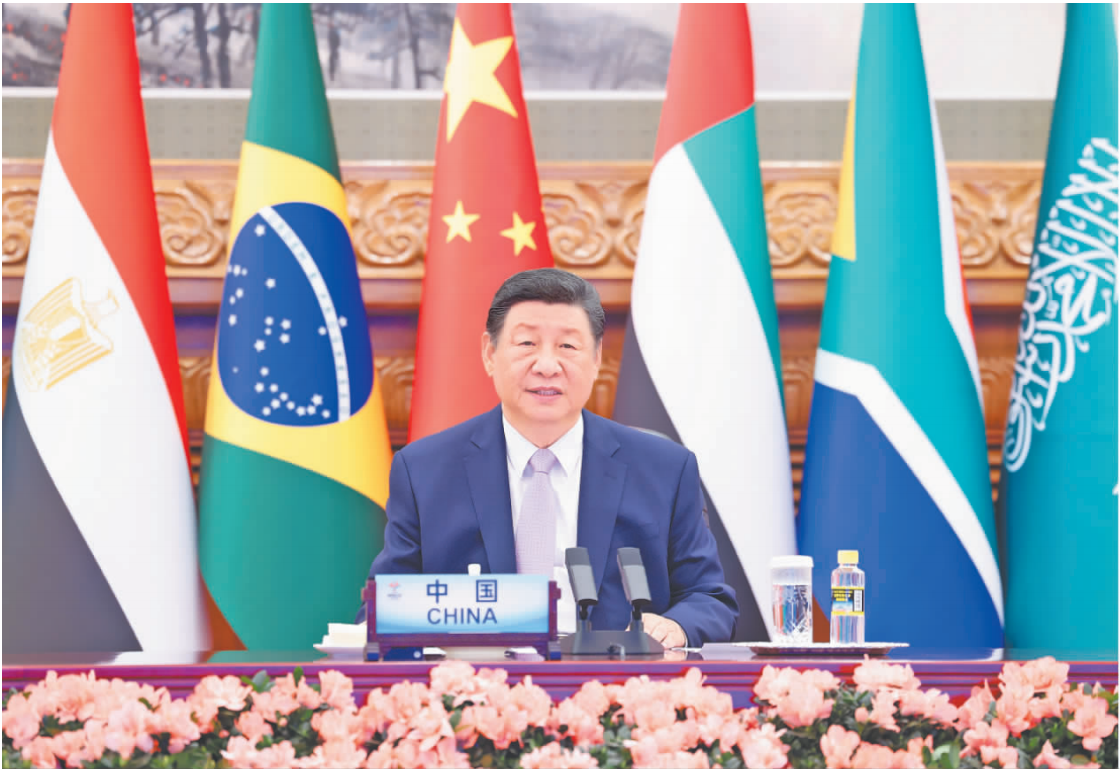 习近平指出,当前,世界百年变局加速演进,霸权主义、单边主义、保护主义甚嚣尘上。金砖国家作为全球南方第一方阵,要坚持弘扬开放包容、合作共赢的金砖精神,共同捍卫多边主义,维护多边贸易体制,推进“大金砖合作”,携手构建人类命运共同体。