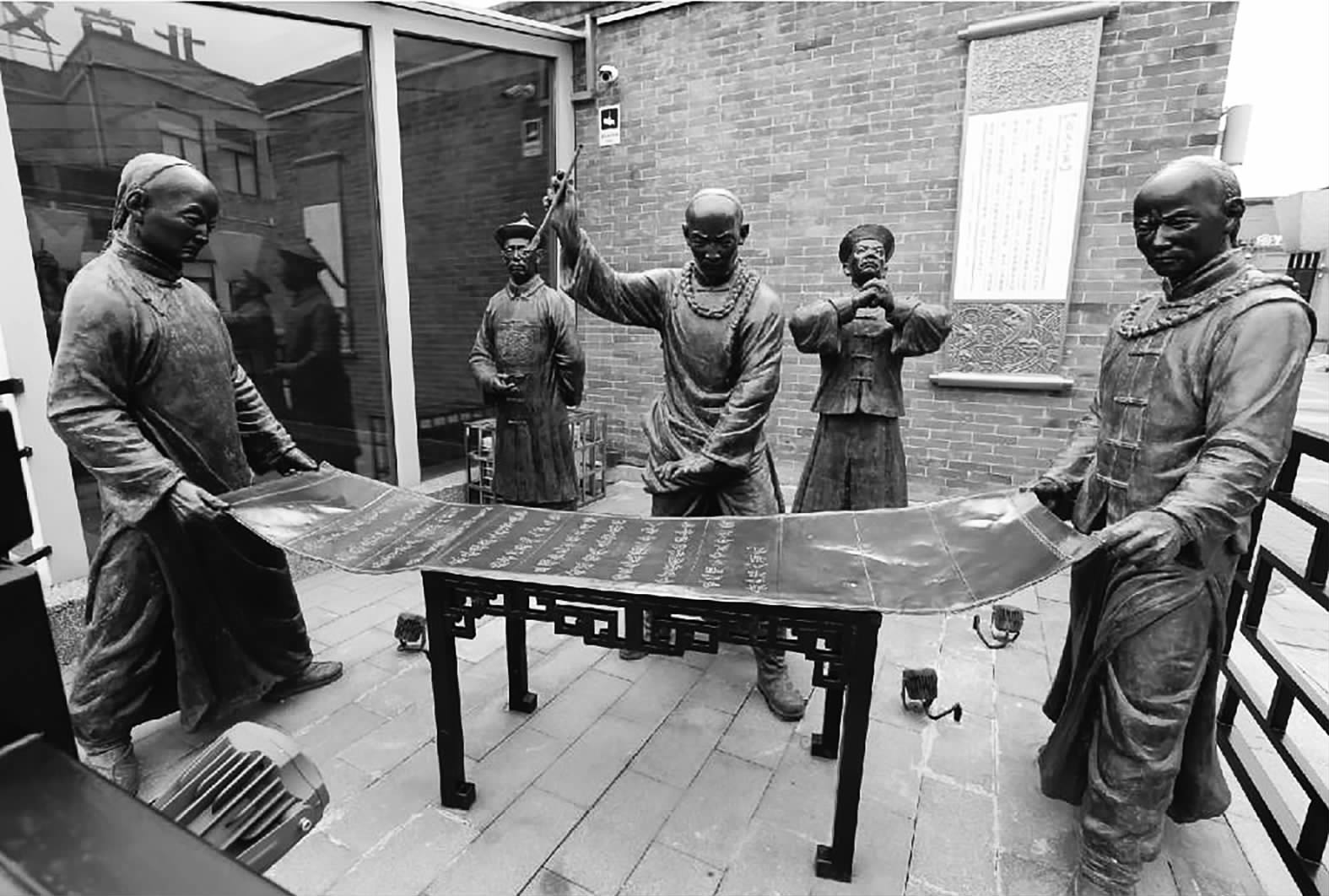 图(5):在京应试台籍举人汪春源、罗秀惠、黄宗鼎和台籍官员户部主事叶题雁、翰林院庶吉士李清琦等联名泣血陈情,反对割台。图为北京台湾会馆旁边的“五人上书”塑像。