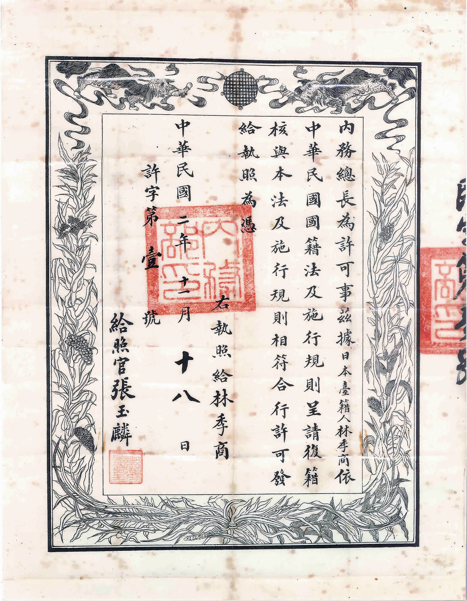 图(6):辛亥革命后,越来越多的台胞主动放弃日本籍而申请恢复中国国籍。图为被称为“台胞恢复华籍”第一人的雾峰林家林祖密的“许字第一号”复籍批文。